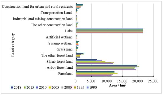 Changes in the number of different categories in the Fuxian Lake basin from 1990 to 2018.