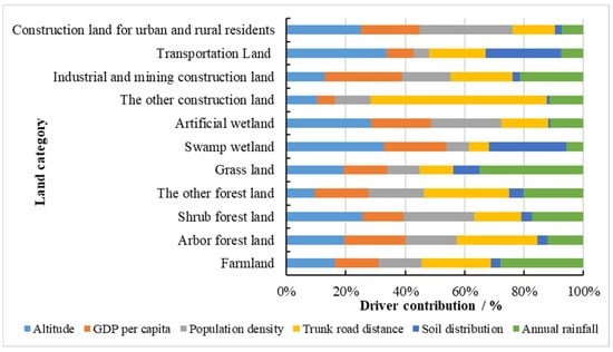 Contribution of driving factors to changes in various categories of land use.