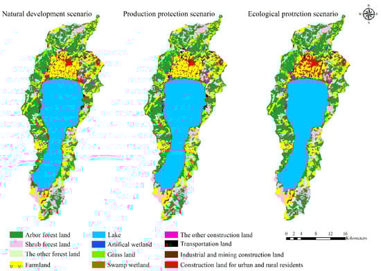 3. The results of a multi-scenario simulation showed that under the natural trend development scenario, farmland occupied a large number of arbor forests, the shrub forest land largely degenerated into grassland, and the urban and rural residents’ construction land expanded onto farmland, swamp wetlands, and other land types. Farmland showed an increasing trend under the production protection scenario. Under the ecological protection scenario, the arbor forest land showed positive growth, while the negative growth rate of shrub forest land decreased. In the Fuxian Lake basin, the main direction of land-use changes is the exchange of farmland and forest land, as well as the constant growth of construction land.
