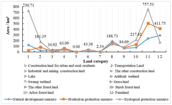 Figure 6 shows the comparison of land types in critical areas with respect to land-use changes under the three scenarios. Figure 7 shows the spatial distribution of hotspots of land-use changes. In terms of land use, the number of hotspots in the ecological protection scenario was the largest, with an area of 2369.34 hm2. The number of hotspots under the production protection scenario was second, with an area of 1498.41 hm2. Farmland and forest land were the hotspots in the Fuxian Lake basin. The growth of farmland space was mainly at the cost of reducing the spatial development of urban and rural residential construction land. The number of hotspots under the natural trend development scenario was the least, with an area of only 1086.21 hm2. Farmland, arbor forest land, urban and rural residential construction land, and grasslands were all hotspots in the Fuxian Lake basin. The development of farmland and forest land was relatively strong, and there was a contradiction between squeezing and occupying land space.