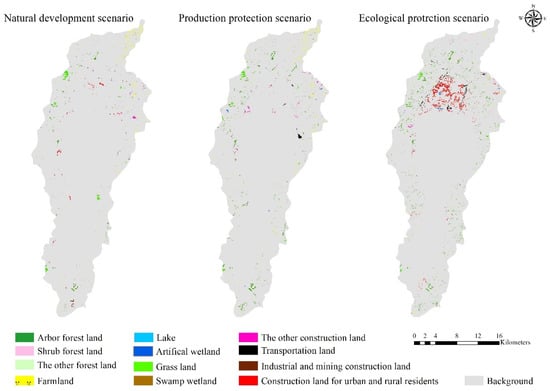 In geographical space, the northern part of the study area consisting of the coast of the north Fuxian Lake and the southern land, was the hotspot of land-use changes. Under the ecological protection scenario, compared with the other two scenarios, shrubland had the smallest reduction and east of the northern bank of Fuxian Lake, the area with an average elevation of about 1800 m showed expansion. On the land north of Fuxian Lake, a large number of contiguous forest land showed a large number of infiltration expansions around the road. The land for construction and transportation of urban and rural residents was only dispersed and expanded from the original area. The reason is that this area was originally residential land and farmland, with gentle terrain and surrounded by forest land on three sides. In this situation, the development of forest land restricted the conversion of construction land outside the ecological space under the natural trend development scenario. The other forest land showed simultaneous expansion with forest land and shrub forest land on the south bank of the study area and west of the northern bank of Fuxian Lake; grassland, which had a reciprocal transformation relationship with arbor forest, expanded the most in this scenario. These results indicate that the conversion potential of the other forest land is very large and flexible, which can be used as the first consideration for the construction and occupation of the forest lands. At the same time, attention should be paid to the grassland to prevent the potential degradation of forest land into grassland. In the production protection scenario, the farmland in the northern part of the region with the highest annual rainfall presented a large and concentrated development trend. At the same time, artificial wetlands such as reservoirs and ditches, which are helpful for irrigation and auxiliary uses, and transportation land have a certain growth distribution along with the expanded cultivated land. It shows that regional production development is closely related to transportation land and artificial wetland, and it is important to consider the development of such land in land planning in regards to the development of production.