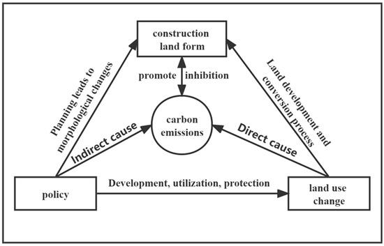 Land use changes in Lhasa metropolitan area are based on policy changes by the central and local governments in China, and the land use changes are directly responsible for the increase in carbon emissions. However, the real microscopic factor that contributes to changes in carbon emissions is the change in construction land, especially its spatial patterns. Therefore, based on policy changes, land use changes, and changes in the spatial patterns of construction land, this paper will propose a logical hypothesis that the internal compactness, complexity, and connectivity of construction land may affect the changes in carbon emissions. Local policies, land development, and the urban form and changes in it resulting from changes in the first two elements are the core factors leading to significant changes in local carbon sources, and thus in total carbon emissions. The proposal and adjustment of policies and the design and implementation of planning may lead to certain changes in local land use; affected by the development and transformation of different types of land, construction land will develop in different patterns. These patterns and their changes are the core microscopic factors that lead to a significant increase or decrease in local carbon sources. The logic hypothesis diagram is shown in Figure 2.