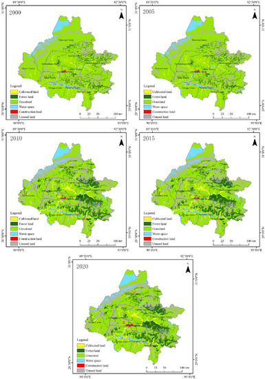 The land data of Lhasa metropolitan area in this study came from the Science data Center of Resources and Environment of the Chinese Academy of Sciences (http://www.resdc.cn accessed on 1 June 2021.) for five periods from 2000 to 2020. The land is classified into 6 types, namely forest land, grassland, cultivated land, water space, construction land and unused land; the accuracy is 30 m.
