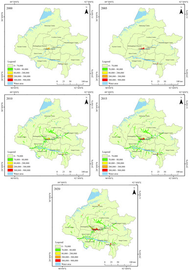 - From 2000 to 2020, the total carbon emissions on land use in the Lhasa metropolitan area showed an overall increasing trend, characterized by “slow acceleration–slight deceleration–acceleration”, with a deceleration period from 2005 to 2015, specifically 193,457.90 t, 246,952.35 t, 231,947.10 t, 237,994.02 t, and 745,688.45 t for 2000, 2005, 2010, 2015, and 2020, respectively. Compared with cities in the eastern plains, cities in the Lhasa metropolitan area had lower carbon emissions of land use [36], much smaller than those in the Xining metropolitan area.