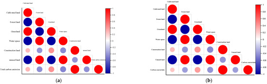 Correlation between land types and total carbon emissions, carbon source/sink. (a) Correlation between land types and total carbon emission; (b) Correlation between land types and carbon source/sink.