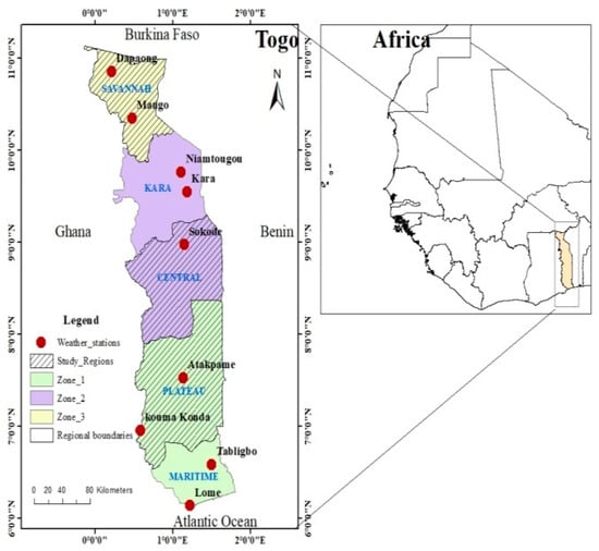 Located between 6° N and 11° N latitudes and 0° E and 2° E longitudes and with a surface area of 56,600 km2, Togo is a small West African country. The country is divided into five administrative regions: the Savannah and the Kara regions in the north, the Central region, and the Plateau and Maritime regions in the south. Togo has a tropical climate, which is characterized as a part of the hot and humid inter-tropics marked by two main wind flows: the monsoon, which blows from the southwest and is associated with the rainy season, and the airstream harmattan from the northeast, which brings with it cool, dry weather between November and March; periodic droughts occur in the north while floods are more recurrent in the south part of the country [21].