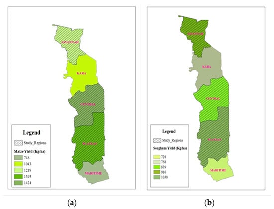 Average yields for maize (a) and sorghum (b) in Togo’s five administrative regions (1990–2019).