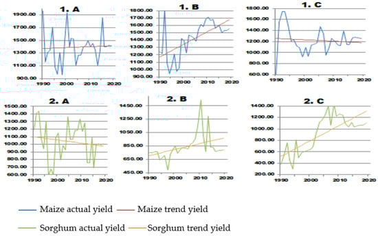 Actual yield and linear trend yield from 1990 to 2019 for maize and sorghum in the Plateau (1.A,2.A), Central (1.B,2.B), and Savannah (1.C,2.C) regions.