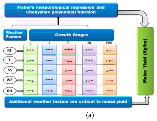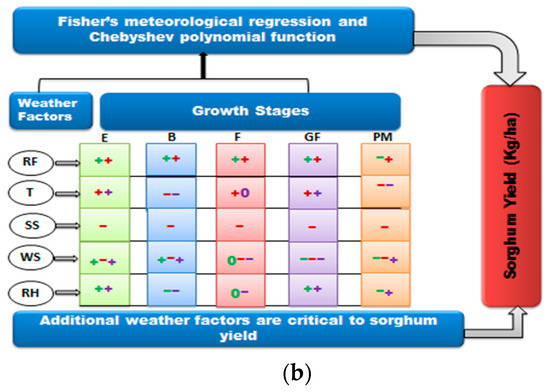 where denotes the meteorological yield; is a constant. τ = growth stage of maize/sorghum from 0 as sowing stage with jth independent period; are the meteorological yield of independent variables [X1 = rainfall (RF), X2 = average temperature (T), X3 = sunshine (SS), X4 = wind speed (WS), and X5 = relative humidity (RH)]; denotes the function of the independent variable in the model. t (year) is the maize/sorghum jth growth durations) the independent variable in the model. From the emergence to the physiological maturity stage, the effect of each meteorological element was calculated using Equations (9a) and (9b).