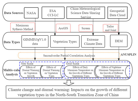 This study’s main objective was to investigate the mechanism of diurnal warming on the growth of typical vegetation types in China’s north–south transitional zone. We had two specific questions: (1) How does diurnal warming promote or inhibit vegetation growth at the site and raster scales? (2) How does diurnal warming affect the growth of typical vegetation types (grass, scrub, deciduous broad-leaved forest, evergreen deciduous broad-leaved mixed forest, evergreen broad-leaved forest, coniferous forest, and crops), and are there any differences in the response of various vegetation types to diurnal warming? First, we collected GIMMIS NDVI data, meteorological station data, and maps of vegetation type. The precipitation and daily minimum/maximum temperature datasets at the raster scale were formed by ANSUPLIN interpolation. Second, we measured the degree and significance of diurnal warming on vegetation NDVI at the site scale using second-order partial correlation. After controlling for precipitation variables, we further identify the effects of daily maximum temperature (Tmax) and daily minimum temperatures (Tmin) on typical vegetation. Finally, based on the interpolated climate data and NDVI, we applied second-order partial correlation to measure the degree that diurnal warming at the raster scale affects the NDVI of different vegetation types.