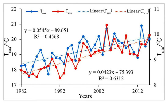 Variation trends of Tmax and Tmin in Qinba Mountains from 1982 to 2015.