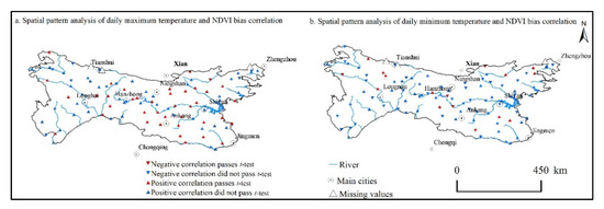 The GIMMIS sensor NDVI and Tmax bias second-order correlation are computed in this paper, by excluding the effects of precipitation and Tmin (Figure 5). About 91.2% of the 92 meteorological stations in the Qinba Mountains showed a positive correlation, of which about 24.09% passed the t-test (p < 0.01) and 21.68% of the stations passed the t-test (p < 0.05). The percentage of meteorological stations that passed the negative correlation test was 8.7%, among which about 12.5% displayed a negative correlation (p < 0.05). After removing the effects of precipitation and Tmax, about 53.25% of the meteorological stations showed a positive correlation between NDVI and Tmin. Where about 2.04% passed the t-test (p < 0.01) and about 20.4% of the meteorological stations were positively correlated (p < 0.05). Similarly, about 46.75% of the meteorological stations displayed a negative correlation between vegetation NDVI and Tmin, with about 9.3% showing a negative correlation (p < 0.01) and about 2.3% with a negative correlation (p < 0.05). The stations where NDVI and Tmax passed the t-test were relatively large and concentrated in the middle- and low-elevation regions. In contrast, the sites where NDVI and Tmin passed the t-test were scattered at the edges of the Qinba Mountains, such as in the northwest, northeast, and southeast.