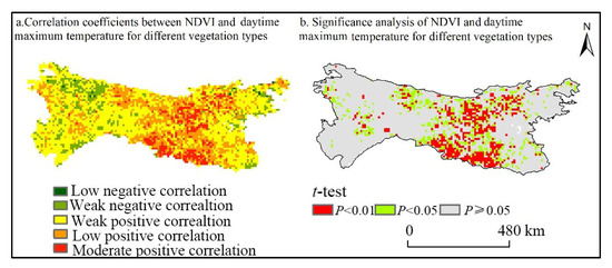 where r is the partial correlation coefficient; n is the number of samples; q is the number of degrees of freedom. Referring to previous studies [53] and based on the actual situation, the correlation coefficient between vegetation NDVI and day–night temperature increase was divided into moderate positive correlation (0.5 ≤ r < 0.8), low positive correlation (0.3 ≤ r < 0.5), weak positive correlation (0 ≤ r < 0.3), weak negative correlation (−0.3 ≤ r < 0), and low negative correlation (−0.5 ≤ r < −0.3) and moderate negative correlation (−0.8 ≤ r < −0.5).