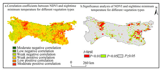 Correlations (a) and t-test analysis (b) between NDVI and nighttime minimum temperatures (Tmin) of different vegetation types from 1982 to 2015.