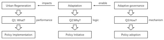 The literature regarding the periodization of urban regeneration in both Western and Chinese cities has explored various generations with distinct aims, actors, resources, and actions determined by policies. These studies mainly focused on “what” and “why” these policies and practices have changed. However, outside of a couple of exceptions, such as Healey [51], few studies have investigated “how” changes have occurred between various policy versions. To fill this gap, adaptive governance, which focuses on how a governed social–ecological system can respond to a highly dynamic and uncertain circumstance, might be helpful [52].