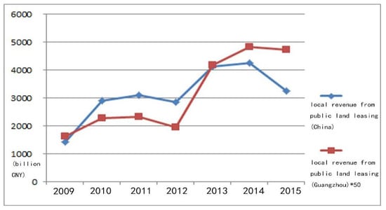 Land leasing income in China and Guangzhou (2009–2015). The number of local revenue from public land leasing (Guangzhou) has been multiplied by 50 to compare to the total number of the country in terms of changes.