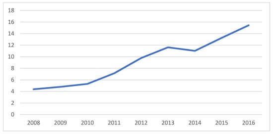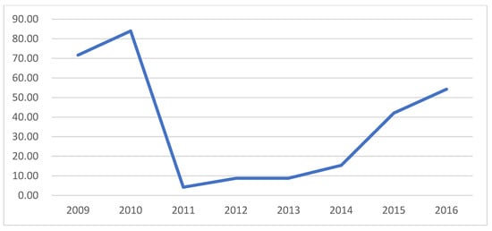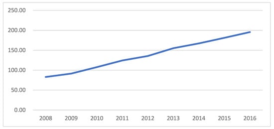 Such a decrease may be considered as due to the influence of TOR. In Chinese cities such as Guangzhou, fiscal income from land leasing is crucial for local revenue; land leasing income is influenced by demands of housing from the increased urban population, the expectation of economic growth and approaches of land leasing (auction or negotiation) [87,88,89]. Between 2009 and 2012, changes in GDP, urban population and housing prices did not match the tendency of changes in land leasing revenue [70] (see Figure 4, Figure 5, Figure 6 and Figure 7); it seems that land leasing methods might be more important to influence land revenue because the open auction is better than negotiation to obtain incomes [90]. As land leasing through negotiation is the most important incentive for urban regeneration in the TOR 1.0 phase, to increase land leasing income to release political pressure from debts, it is reasonable for the local government to depress negotiation and encourage auction in the No. 20 municipal government document, which indicated the beginning of TOR 2.0 phase.