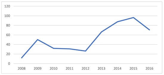 The effects of phase 2.0 of TOR were apparent. On the one hand, the number of established TOR projects significantly declined. For example, from 2009 to 2012, 27 old villages, 222 old factories, and one old town were approved at the municipal level as TOR projects; however, between 2012 and 2015, under TOR phase 2.0, no old villages or towns completed the administrative procedures required for construction, and the municipal government permitted only around 30 old factories to redevelop [69]. On the other hand, land supply through TOR decreased due to the reduced number of projects; therefore, land transactions through open auctions, monopolized by the local state, increased. Such expansions increased the land revenue of municipal governments. From 2009 to 2012, land revenue was 32.3, 45.6, 46.5, and 38.9 billion CNY; then, in 2013, 2014, and 2015, the number jumped to 83.8, 96.7, and 94.8 billion CNY (see Figure 3) [77]. Regarding the total land revenue at the national level, 4.13, 4.26, and 3.25 trillion CNY in these 3 years, the revenue of Guangzhou was equal to 2.03%, 2.27%, and 2.92% of the whole national income from land leasing [78]. These percentages are higher than those between 2009 and 2012, which were 2.27%, 1.57%, 1.49%, and 1.37%.