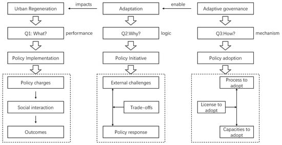 Studies in urban regeneration emphasize “what” has changed in different phases and “why” these changes have happened; research on “how” to change between these distinct phases is limited. Adaptive governance literature is introduced to bring “how” issues into “what” and “why” ones. To not only fill the gap but also extend existing thoughts into new ideas, our paper develops a three-level frame with three research questions: (1) What has changed in urban regeneration? (2) Why did these changes happen? (3) How did social–political mechanisms enable such changes?