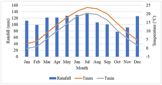 Average monthly rainfall, maximum and minimum temperature at Harlan County, Kentucky (1990–2019). Data Source: PRISM Climate Group (https://prism.oregonstate.edu/normals/ (accessed on 20 April 2020)).