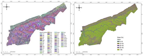 Input data for the SWAT model: a. Soil classes and b. Slope map of the Cumberland River near Harlan watershed.