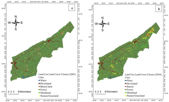 Land use and land cover map of the study area for the years 2001 (a) and 2016 (b).
