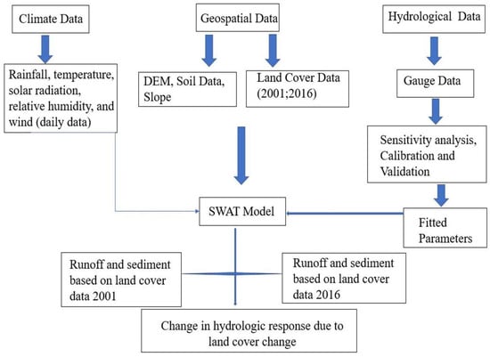 The Soil and Water Assessment Tool (SWAT) is one of the most widely adopted watershed models worldwide used to predict surface runoff and sediment yields over a long period in complex catchments with different soils and land use [32]. The SWAT model has been widely used to simulate changes in hydrology and water quality (nutrients and sediment) in watersheds under different climatic conditions, land use practices, and land cover changes [33,34,35,36,37]. Taking the hydrological behavior of the watershed into consideration, the application of the SWAT model integrated with GIS and remote sensing can be used to estimate surface runoff and sediment yield. Various studies have been conducted worldwide to understand the relationship between land cover change and hydrological processes in watersheds at different spatial and temporal scales by using the SWAT model. For example, Zhang et al. [35] used the SWAT model to simulate runoff and sediment yield responses to land use change in China and found that forestland decreased sediment yield and reduced runoff. However, they reported increased runoff and sediment yield in cropland and urban land. Similarly, Pokhrel [33] analyzed the impact of land use changes on river discharge and sediment yield from 2000 to 2010 at the Khokana gauging station of Kathmandu valley, Nepal. Findings showed an increase in built-up areas, resulting in an increase in the surface runoff and sediment yield. Aboelnour et al. [38] studied land use change impact on streamflow and baseflow in the Little Eagle Creek watershed in Indianapolis, USA. The study found a 39% increase in urbanization, which significantly influenced base flow and streamflow. Spruill et al. [39] used the SWAT model to simulate daily streamflow in a small central Kentucky watershed over a two-year period. Likewise, Yonaba et al. [10] used SWAT to show that dynamic land use conditions affect surface runoff and hydrological processes in the Sahelian landscape.