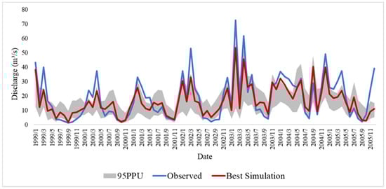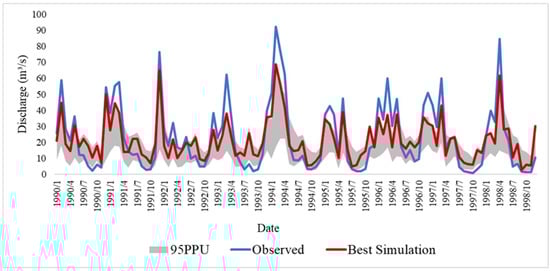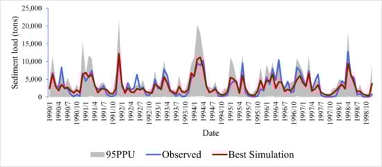 The calibration period for this study was 1990–1998, which means measured observed data of this time period were used with different adjusted parameter value ranges to fit with the simulated model. After calibration was obtained, the model was validated with calibrated parameter ranges using observed data from 1999–2005. Discharge was calibrated at first, as it is the primary controlling variable [50]. Similar processes were repeated for the sediment load obtained from the LOADEST model.