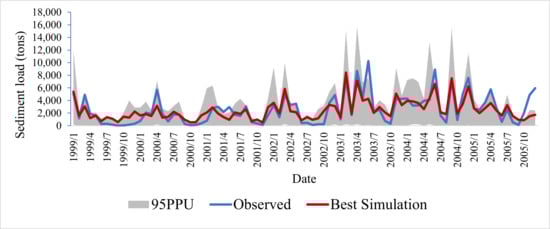 Sediment was found to be the most sensitive to v__CH_N2.rte (p-value = 0, t-stat = −20.88), r__CN2.mgt (p-value = 0, t-stat = 6.43), v__ALPHA_BF.gw (p-value = 0.05, t-stat = 1.88). The graphical representation of monthly sediment data during the calibration and validation period is shown in Figure 7 and Figure 8, respectively. The P-factor was 0.91 during calibration and 0.90 during validation. This represents that 95PPU bracketed 91% and 90% of observations during calibration and validation, respectively. The R-factor was 1.60 during calibration and 1.79 during validation, which represents the uncertainties of the model. P-factor and R-factor are used to judge the strength of calibration and validation [45]. Our result showed strong statistical agreement with more than 90% of observed data enveloped by our modeling result, shown as the 95PPU graph in Figure 8 and Figure 9.
