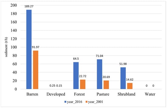 Contribution of different land cover classes on sediment yield between the years 2001 and 2016.