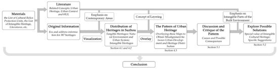 To achieve this purpose, this research investigates and analyzes the heritage of Suzhou based on the HUL approach, which emphasizes contemporary areas and intangible parts of the built environment. Firstly, the approach is to visualize the addresses of heritages in the official urban heritage list of Suzhou (Figure 1). Then, map their spatial distribution in built-up and unbuilt-up areas by type, and identify the value and the process of their changing the context of Suzhou. Materials are obtained from the list of cultural relics protection units at all levels provided by the Suzhou government, the list of intangible heritage, historical documents from local libraries, ancient maps, and local chronicles.