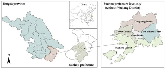 Today, Suzhou consists of six districts with Gusu District as the ancient city. Gaoxin District, the industrial park, Xiangcheng District, and Wuzhong District are all new urban areas established after 1949. This research takes these five districts as the object (Figure 2). Wujiang District is a county-level city incorporated into the urban area of Suzhou in 2012, and because it is relatively independent in the process of urban development like Kunshan and Changshu (two county-level cities in Suzhou prefecture) [22]. Thus, Wujiang District is not included in the discussion.