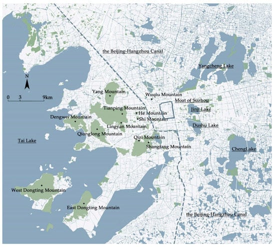 Suzhou belongs to the Tai Lake Plain, which is a typical water network plain. The hills in the region of Suzhou are mainly located in the Wuzhong and Gaoxin districts [5]. The main hills are in the north-east direction, forming four groups and some isolated residual hills on the plain [23]. These hills provide environmental support for the many temples and other heritage sites in Suzhou that are built on mountains (Figure 3).