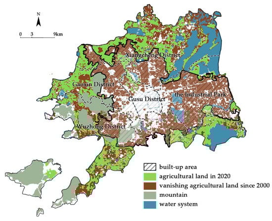 As it is in a region where rice is the main crop, polder fields (paddy fields surrounded by earthen dikes) have been an important mode of farming in Suzhou since the founding of the city in the Spring and Autumn period and became mature during the Tang and Song dynasties, when the large polder system began to disintegrate and gradually shifted to a small polder system during the Northern Song dynasty [28], which established the main layout of polder fields in Suzhou thereafter. After 1949, due to the low resilience of the polder fields left by the Republic of China (ROC), which led to flooding caused by successive breaches of the dike, the polder and related river channels were transformed and the joint polder model was implemented in the 1950s onward, allowing the polder to transfer water surface and gradually developing electromechanical drainage and irrigation, which improved resilience to droughts and floods. By the end of the last century, polder fields accounted for 53.3% of the total arable land area in Suzhou [29]. By 2000, agricultural land was still the largest land type in Suzhou, but due to the rapid urbanization in the following 20 years, the urban built-up area massively eroded the original agricultural landscape base, except for a small amount of preserved arable land, and the rest is mainly distributed outside the urban built-up areas (Figure 4). (For the determination of the built-up area of Suzhou in this article, please refer to our previous article [7].