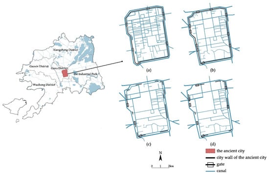 The city walls and pattern of water and streets in Suzhou in Song Dynasty (a), Late Qing Dynasty and the Republic of China (b), 1985 (c), 2020 (d).