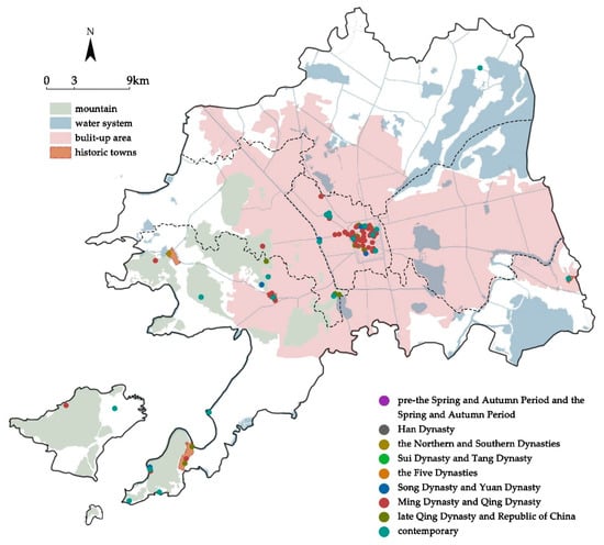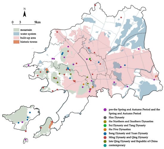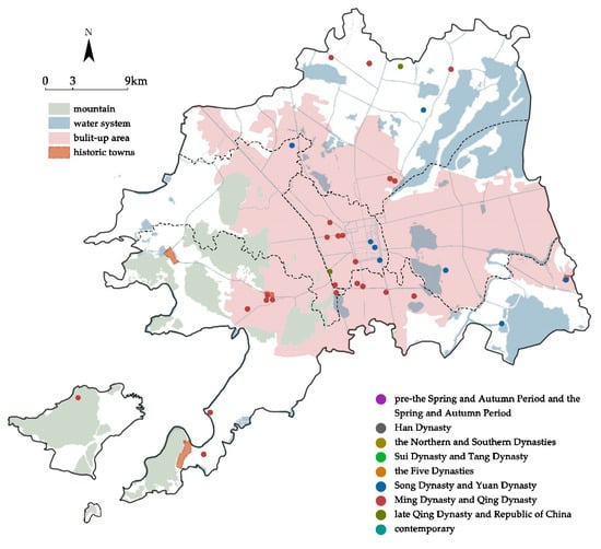 The chronological distribution of the relics and tombs is more even than that of the buildings and bridges, and it is especially noteworthy that these relics and tombs are not highly concentrated in the ancient city, but are more distributed around the hills on the west side of Suzhou, and with a relatively even distribution in the built-up area (Figure 9).