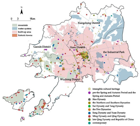 This paper classifies the urban context elements of Suzhou’s prefecture-level city into three categories, namely natural heritage, tangible heritage, and intangible heritage, and summarizes the spatial distribution characteristics of these elements by visualizing them, to point out the disconnect between urban heritage conservation strategies and urban development in Suzhou’s current built-up area. The analysis reveals that the urban heritage in Suzhou has been layered in a process of historical changes. The heritage of each period from the Stone Age to the Republic of China has survived, but a large amount of heritage was destroyed under the influence of the modern social development and the production movement in the early period of the founding of the People’s Republic of China. In the 1980s, urban conservation was again emphasized, and the urban heritage of each region began to be gradually protected and classified. However, the change in the main mode of urban development in Suzhou has shifted the direction of development from the west side to the east side of the city, which is mainly agricultural land.