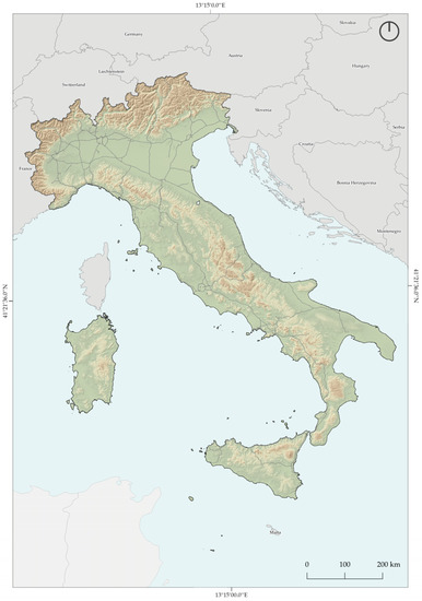 Study area—the analysis refers to the whole Italian territory, which is represented with reference to orography and major road infrastructure.