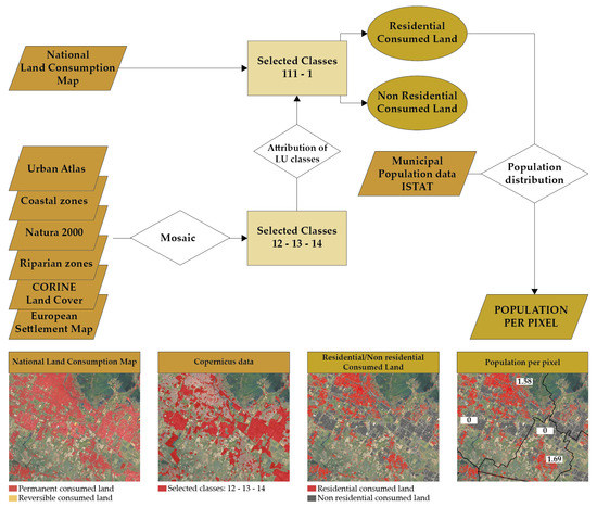 The spatial distribution of the population was analyzed starting from the ISTAT data on total municipal population, considering for each municipality a uniform distribution of the inhabitants among the “residential” pixels. Ancillary data were introduced to identify the residential areas: Starting from the LCM, the buildings were identified and then, using the CLMS and ESM data, the residential ones were selected.