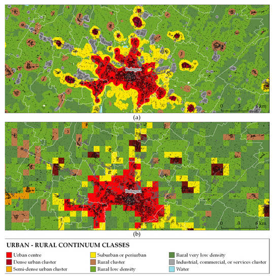 Urban area of Bologna: comparison between (a) classification of the urban–rural continuum from the proposed data (2018) and (b) GHS-SMOD (2020). The two data are consistent with regard to the distribution of the different classes; however, the proposed data represent with higher geometric detail the edges of dense urban centers and the spatial configuration of small and medium-sized clusters that have developed around the main metropolitan areas.