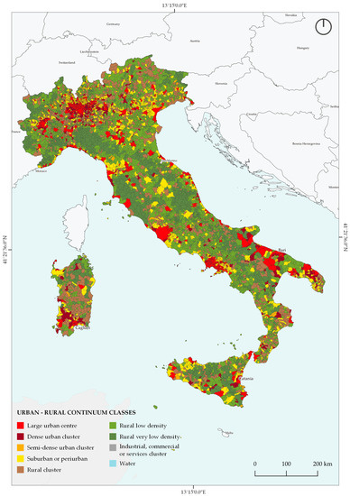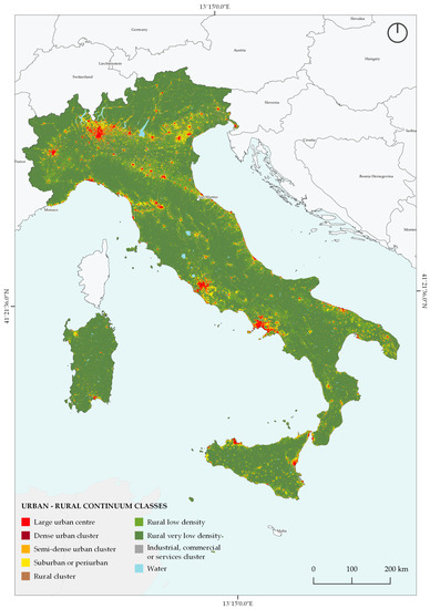 Eurostat proposes a harmonized methodology to improve the quality of urban statistics starting from the classification of the entire territory along an urban–rural continuum. The scheme is based on the combination of population data (represented by a grid of 1 km²) and density of artificial surfaces, with the aim of overcoming the traditional urban–rural dichotomy [28,30]. The Joint Research Center (JRC) has implemented Eurostat’s methodology by introducing the Global Human Settlement Layer (GHSL), which offers information on a global scale, based on the combination of total resident population density [31,32].