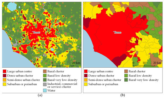 The application of the Eurostat/JRC methodology to the Italian context shows encouraging results, improving the representation of the territory compared to other current available national and international data. The distinction between low-density clusters and surrounding periurban areas can be further improved, but more detailed information on the spatial distribution of the population would be needed. Furthermore, the future introduction of LU information on the LCM will also allow a more accurate discrimination of residential areas from non-residential ones; the integration with an auxiliary database (i.e., satellite images and socioeconomic data) could support the creation of dasymetric maps useful for improvement of the limitation related to the availability of disaggregated census data [48].
