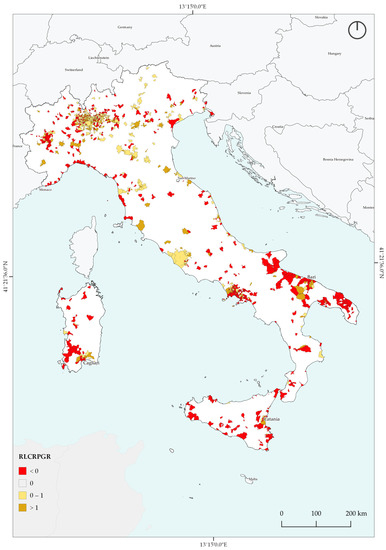Regarding the PGR, ISTAT produces and annually updates the official demographic data for Italy, providing the total municipal population as more detailed data. These data do not allow for spatially characterizing in which areas of the municipality population variations occur. Actually, it is not possible to evaluate the population variation with respect to urban areas, as, in some cases, they only occupy a portion of the municipal territory, and in others, they include more municipalities. In accordance with the Eurostat/JRC methodology, the calculation was, therefore, carried out on a municipal scale, associating the prevailing urban–rural class with each administrative unit (i.e., the one in which the majority of the population is concentrated) [31]. The indicator was calculated for the period 2012–2018 on the municipalities classified as “Urban Center”, “Dense Urban Cluster”, and “Semi-dense Urban Cluster”.
