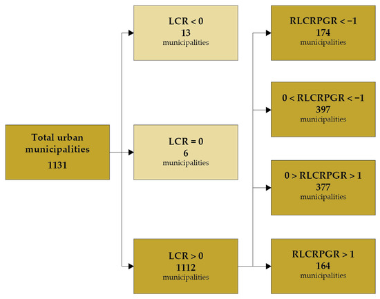 The value of the indicator depends on the two terms LCR and PGR. If they are both positive (increase in land consumption and population) or negative (decrease in land consumption and population), the indicator assumes positive values; otherwise, it is negative. For the interpretation of the RLCRPGR indicator, it is important to observe the sign of LCR and PGR, as the same RLCRPGR value can represent different dynamics (for example, a negative RLCRPGR value can derive from an increase in PGR and a decrease in LCR or from an increase in LCR and a decrease in PGR) (Table 2).