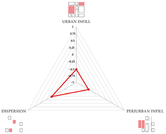 The calculation of the three indicators for the 1131 urban municipalities shows the results of Figure 11 and Figure 12, with a tendency to infill in the main provincial municipalities and a concentration of land consumption in the rural area in the other municipalities, with a tendency toward dispersion in areas with low settlement density.
