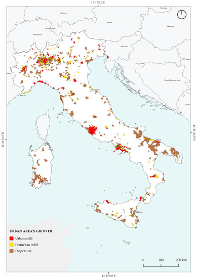 Historically, city size and economic growth have been described as strictly correlated [49] and, in combination with population growth, have generally driven land consumption dynamics. This paradigm has lost its validity in recent years; indeed, the significant urban growth detected in recent decades is completely unrelated to the demographic dynamics both in Italy and at a global scale [3]. Furthermore, the intense migratory flow to urban areas has led to an unplanned growth of cities, which usually expand their geographic boundaries [50]. In this context, monitoring the state and evolution of urban areas is essential for defining strategies aimed at sustainable management and development of settlements [51].