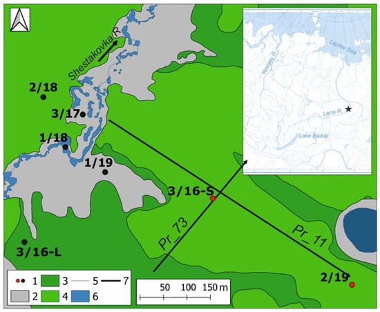 The geological structure of the Left Shestakovka river floodplain is described in detail by Tarbeeva et al. [24] based on the drilling of borehole 3/17 with a depth of 21 m. Under the peat litter, fine- and medium-grained sands with interlayers of gravel and peat occur from the surface to a depth of 4.7 m. They are underlain by silty sandy loam with peat interlayers and fine-grained sands with interlayers of plant remains. Silty sandy loams and silty sands occur at the base of the section. The ice content of the deposits was greater in the near-surface peaty horizon (>40%). It varied from 17 to 35% in the depth interval of 1–14 m and decreased to 14–15% at depths of 18 and 20 m.