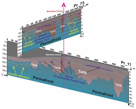 The perpendicular profile Pr_73 is located across the slope. The STL is also clearly visible in the beginning of the profile. Its thickness is from 2.0 to 2.8 m with an average value of 2.2 m. Five taliks with a thickness of 3–11 m were found along the profile at 60 ÷ 150 m, 175 ÷ 190 m, 210 ÷ 226 m from the beginning of the profile.