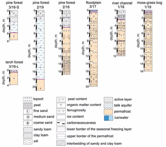 All other boreholes penetrated frozen deposits. Borehole 2/18 (15 m deep), drilled on the left bank of the river in a pine forest, intersected fine-grained sands with signs of ferruginization and thin layers of sandy and silty loams.