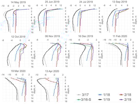 Figure 4. Ground temperature curves at six boreholes for selected dates during the period May 2019–April 2020, °C.